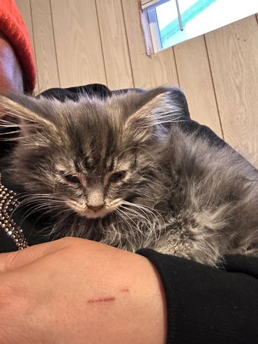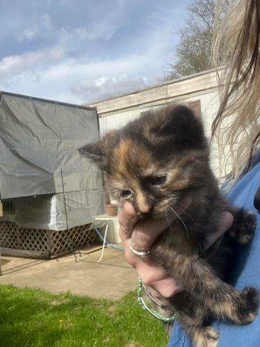 "Cinnamon was a community cat my kids found as a kitten hiding under a trailer over on Larkspur in Brookside in 2024. Apparently she followed them home and had been hanging around my trailer for sometime when she ended up pregnant last year.